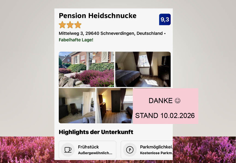 Das 1948 erbaute, liebevoll modernisierte Haus dieser kleinen Pension schafft mit lediglich drei Doppelzimmern eine persönliche und gepflegte Atmosphäre für entspannte Urlaubstage in der Lüneburger Heide.